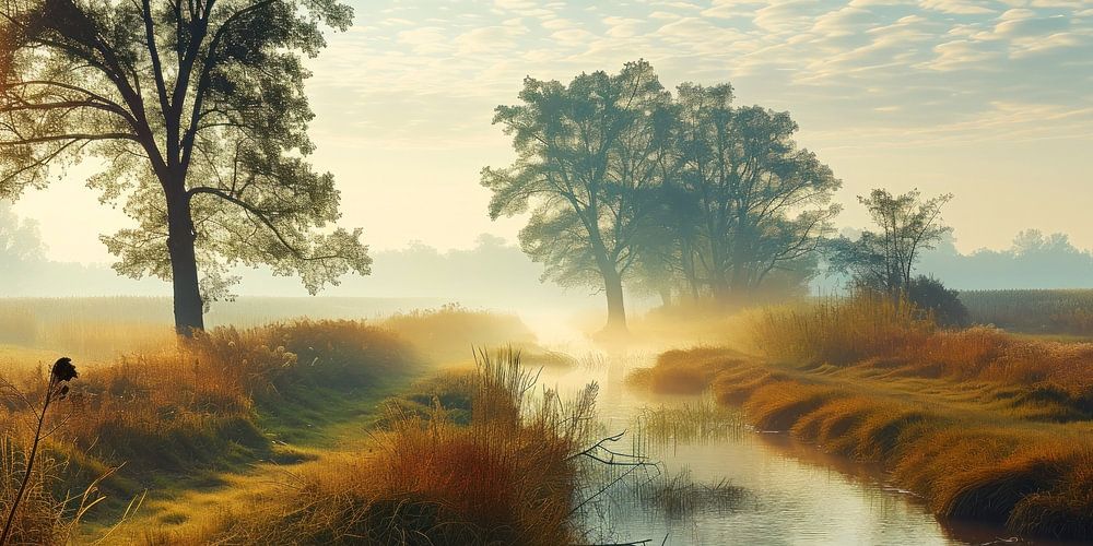 Een klein kanaaltje in Friesland wordt zachtjes omhuld door ochtendmist terwijl de zon opkomt.