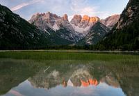 Zonsopgang bij het meer van Dürren in de Dolomieten.