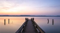De foto toont een loopbrug die naar het meer leidt en het spiegelgladde oppervlak van het meer kort na zonsopgang, terwijl er op de achtergrond nog een beetje mist hangt. Dit geeft de foto een zeer kalme sfeer, die verder wordt benadrukt door de lange belichtingstijd en de minimalistische look.