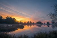 De opkomende zon kleurt de lucht boven het Smitsven op het Dwingelderveld in fascinerende kleuren. Langs het water van het ven staan volle rietpluimen.