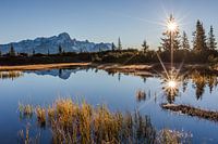 De zon gaat net naast het Dachsteinmassief op en werpt de eerste stralen over het water van de Schwarze Lacke en bosbessenstruiken op de Gerzkopf.