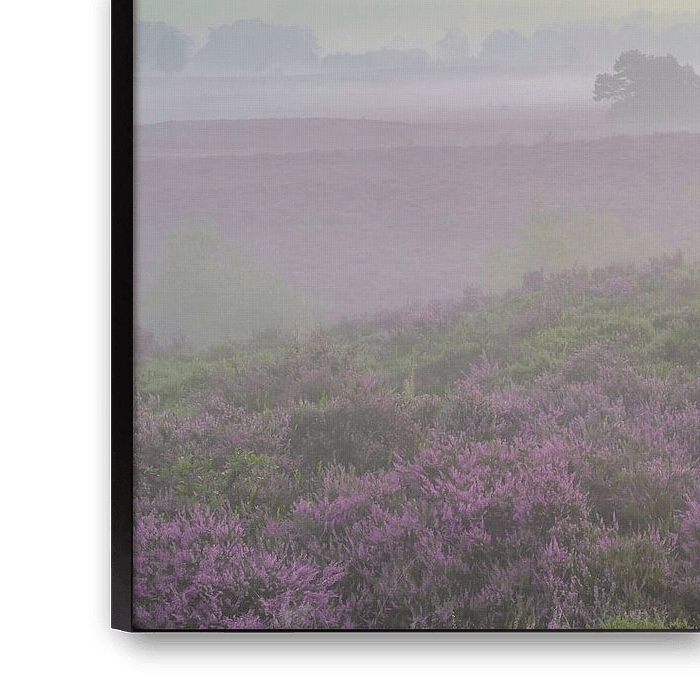 De heide, bedekt met een mix van grassen en heide, komt geleidelijk tot leven als het licht zich over het landschap verspreidt. In de nazomer bloeit de heide in levendige paarse tinten, wat een opvallend contrast vormt met het zonlicht. Mist blijft hangen in de laaggelegen gebieden en voegt een mystieke kwaliteit toe aan het tafereel, terwijl de zon de mist langzaam laat verdwijnen.