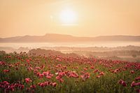 Zonsopgang in een veld met bloeiende klaprozen in Germerode in het Werra-Meißner district in het Frau-Holle-Land Geo-Natuurpark, district Kassel, Hessen, Duitsland.