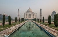 Zonsopgang en ochtendmist in Taj Mahal in Agra - India
