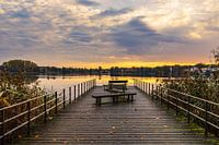 Zonsopgang en steiger aan de Haussee in de stad Feldberg.