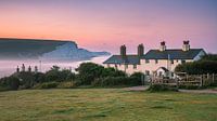 Zonsopgang in Cuckmere Haven en de Cuckmere Valley samen met de Seven Sisters-kliffen in Seaford Head Nature Reserve in East Sussex, Engeland.