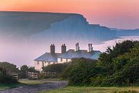 Zonsopgang in Cuckmere Haven en de Cuckmere Valley samen met de Seven Sisters-kliffen in Seaford Head Nature Reserve in East Sussex, Engeland.