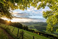 Zonsopgang in Kapf bij Oberstaufen met uitzicht op Steibis en de Hochgrat op het Nagelfluh-gebergte in de Allgäu