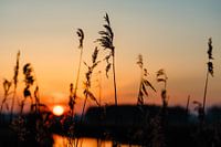 Grassen bij zonsopgang bij de Wiegboldsburer Riede aan het Großes Meer in Südbrookmerland. Aurich district, Oost-Friesland, Nedersaksen, Duitsland.