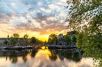 Vroege zomer ochtend, zonsopgang boven de Amstel met uitzicht op Keizersgracht, gezien vanaf de brug.