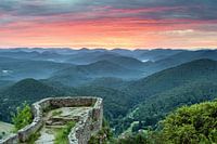Uitzicht vanaf kasteel Wegelnburg in Wasgau in het zuidelijk deel van het Pfälzerwald bij zonsopgang.
