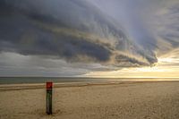 Zonsopgang op de strandduinen van het eiland Texel met een naderende buienwolk boven de Waddenzee op de noordpunt van het eiland tegenover de Waddenzee en Vlieland.