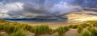 Zonsopgang in de duinen van het eiland Texel met een naderende buienwolk boven de Waddenzee op de noordpunt van het eiland tegenover de Waddenzee en Vlieland.