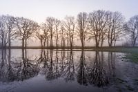 Bij Ruinen, in Nederland, een bomenrij gefotografeerd in de mist bij de zonsopgang bij een bevroren weiland.