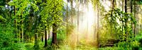 Bos met veel zonlicht. Sprookjesachtig gemengd bos met felle zonnestralen in de mist.