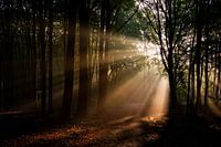 Zonsopgang in het Speulderbos. Zonnestralen breken door de bomen. Het oudste bos van Nederland.