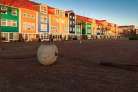 De opgaande zon verwarmt de gekleurde huisjes in de vesting van Hellevoetsluis.