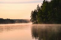 Zonsopgang met mist boven een meer in Zweden bij zonsopgang. Romantische stilte