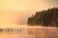 Zonsopgang met mist boven een meer in Zweden bij zonsopgang. Romantische stilte