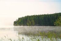 Zonsopgang met mist boven een meer in Zweden bij zonsopgang. Romantische stilte