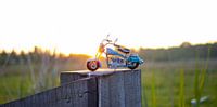 Zonsopgang met een tinnen motor. Staat leuk in een stoere kinderkamer.