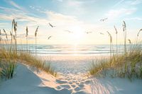 Een zachte wind streelt de duinen terwijl de zon goudkleurig opkomt aan de horizon. Het licht danst op de golven van de kalme zee en meeuwen zweven elegant door de helderblauwe lucht. Groene stengels wiegen in het zand, waar een dag vol mogelijkheden begint. Een plek van ontspanning en eindeloze luchten.