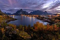 Een kleurrijke en intense zonsopgang in het idyllische Reine op de Lofoten in het noorden van Noorwegen.