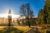 Zonsopgang op de Westweg bij Dobel in het Zwarte Woud in de herfst, Baden-Württemberg, Duitsland