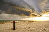 Zonsopgang op het strand van het eiland Texel met een naderende buienwolk boven de Waddenzee op de noordpunt van het eiland met uitzicht op de Waddenzee en Vlieland. Ondanks de naderende indrukwekkende shelf cloud was het sereen kalm op het strand en bijna windstil. Een haast surrealistische ervaring.