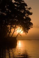 ’s Morgens zijn we vroeg vertrokken met een stil bootje. Om op het water de zonsopgang te zien. De foto bewijst, het was prachtig. Verstilde bomen met hun reflectie vervormd door het zacht golvende water en achter de bomen de grote opkomende zon. Een ochtend in gouden tinten.