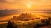 Een adembenemend Toscaans landschap tijdens de gouden uren van de ochtendzon. De zon staat laag aan de hemel, waardoor het landschap wordt overspoeld met een warm, gouden licht.