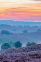 Zonsopgang over bloeiende Heidevelden in de heuvels van de Posbank in het natuurgebied Veluwezoom in Gelderland, Nederland.