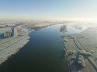 Zonsopgang over de IJssel in de IJsseldelta tijdens een koude winterochtend. Panoramisch landschap met de kronkelende rivier met vorst over de weilanden en uiterwaarden...