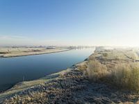 Zonsopgang over de IJssel in de IJsseldelta tijdens een koude winterochtend. Panoramisch landschap met de kronkelende rivier met vorst over de weilanden en uiterwaarden...