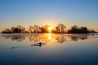 Zonsopgang boven de IJssel tijdens een mistige, koude winterochtend in Nederland. Het water staat hoog en er ligt sneeuw en ijs op de dijken aan de oever van de rivier tijdens deze prachtige zonsopgang.