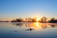 Zonsopgang over de IJssel tijdens een mistige koude winterochtend in Nederland. Het waterpeil is hoog en er ligt sneeuw en ijs op de dijken aan de oever van de rivier tijdens deze prachtige ochtendzonsopgang.