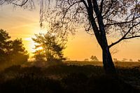 Zonsopgang boven de heide op de Elspeetse Heide in het natuurgebied de Veluwe in Gelderland, Nederland.