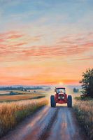 Een heldere ochtendhemel omhult de glooiende heuvels van het platteland terwijl een rode tractor rustig over het smalle pad rijdt. De gouden maïskolf wiegt in de zachte bries en de eerste zonnestralen baden het landschap in een warm licht. Dit moment straalt een vredige verbondenheid met de natuur en agrarische arbeid uit.