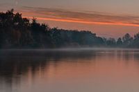 De lucht boven het meer gloeit oranje vlak voordat de zon van achter de horizon tevoorschijn komt.
