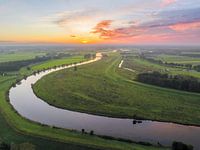 Zonneschijn boven de rivier de Vecht van bovenaf gezien tijdens een mooie herfstochtend in Overijssel, Nederland. De Overijsselse Vecht ontspringt in Oberdarfeld in de Duitse deelstaat Noordrijn-Westfalen en stroomt noordwaarts naar Nedersaksen, over de grens met de Nederlandse provincie Overijssel. Daar stroomt de rivier door de regio Salland en vlakbij Zwolle gaat de rivier plotseling over in het Zwarte Water.