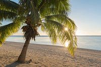 De zon komt op, op het strand van Aitutaki, Cookeilanden. De palmbomen op het strand en de prachtige kleuren van de lagune maken het een paradijs.