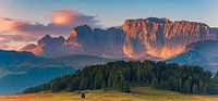 Panoramafoto van een zonsopkomst op Alpe di Siusi (Duits; Seiser Alm), een Dolomietenplateau en de grootste alpenweide op grote hoogte van Europa. Gelegen in de Italiaanse provincie Zuid-Tirol in het Dolomietengebergte.