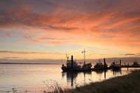 Zonsopkomst in de Ballumerbocht die die als museumhaven en ligplaats voor de reddingsboot van de knrm