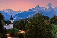 Een vroege ochtend tijdens zonsopkomst bij Bedevaartskerk Maria Gern, met uitzicht op de berg Watzmann en de Berchtesgadener Alpen. Maria Gern is gelegen nabij de stad Berchtesgaden, in Beieren, zuid-Duitsland.