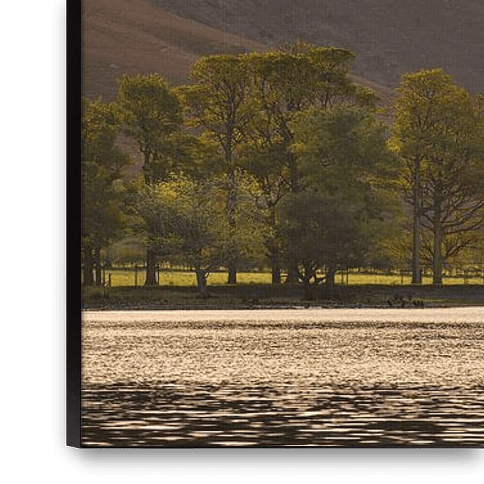 Eerste zonlicht op de bomen aan Buttermere, met in de achtergrond de prachtige bergen.