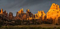 De zonsopkomst bij Devils Kitchen kampeerterrein met de blik naar Chesler-Park in het Needles District in Canyonlands Nationaal Park in de staat Utah, in het zuidwesten van deVerenigde Staten.