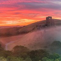 Een vierkante foto van een zonsopkomst bij Corfe Castle, een fort op een heuvel boven het gelijknamige dorp op het schiereiland Isle of Purbeck in het Engelse graafschap Dorset, aan de zuidkust van Engeland.