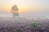 Mooie zonsopkomst op de Kalmthoutse heide tijdens een mistige ochtend