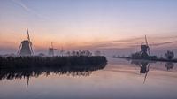 Een zonsopkomst bij de molens van Kinderdijk op een zonnige ochtend in november