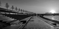 Zwart-witfoto van de zonsopkomst boven de Spiegelwaal met het zonlicht weerspiegeld op de trappen van de Lentse Warande.
